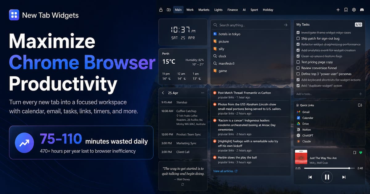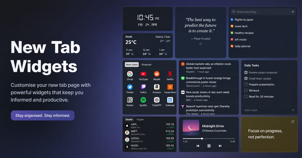 New Tab Widgets enters public beta with v0.1. The initial release brings a fully customisable new tab dashboard with Spotify controls, weather, FuelWatch, OzBargain, and a drag-and-drop widget layout.